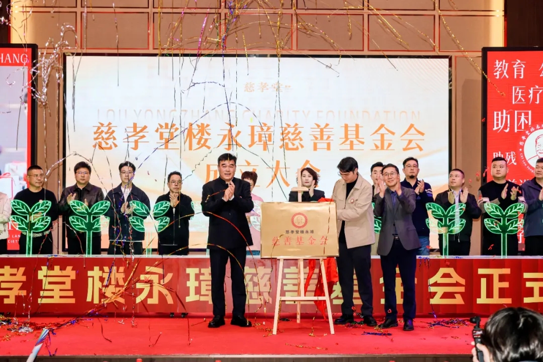 最后,在热烈的掌声中,慈孝堂集团创始人楼中平先生和楼英健康董事长楼乔丹先生共同为“慈孝堂楼永璋慈善基金会”进行揭牌仪式。随着红绸的缓缓落下,“慈孝堂楼永璋慈善基金会”正式启航,开启了传递爱与温暖的崭新征程。